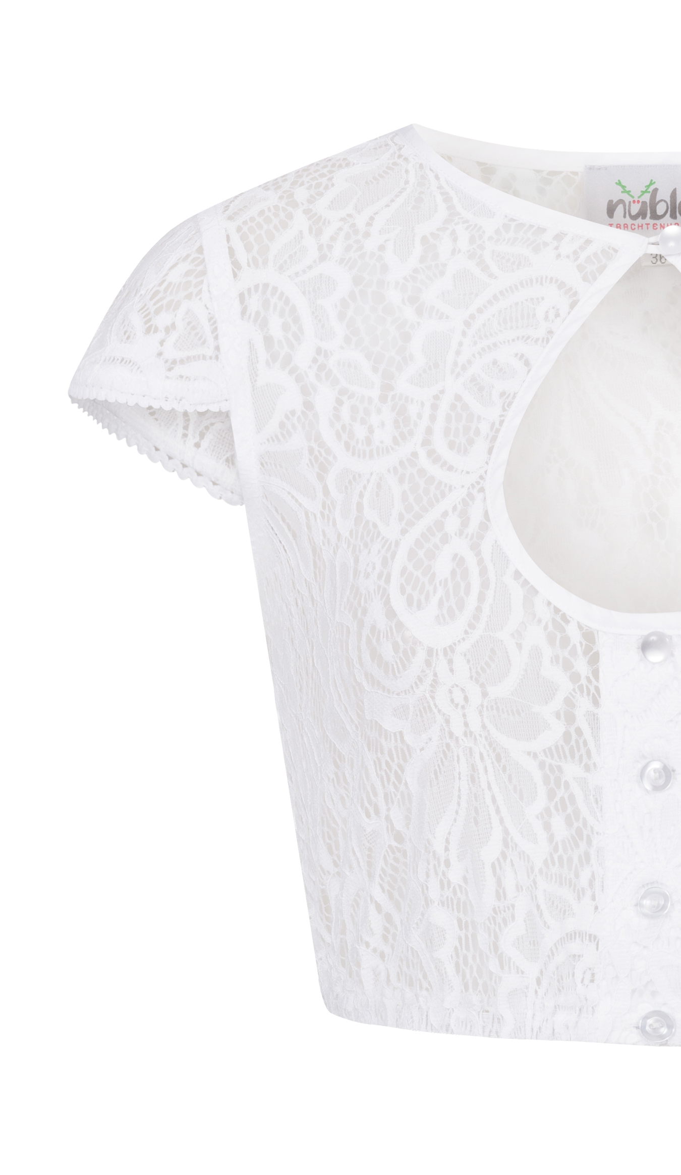 Unsere wunderschöne Dirndlbluse Tara in Weiß von Nübler ist ein richtiger Hingucker. Der Ausschnitt gewährt hübsche Einblicke. Die Bluse wird vorne geknöpft. Die transparente Spitze verleiht der Bluse den verspielten Touch. Ein perfekter Sitz wird durch den elastischen Saum garantiert. Diese Dirndlbluse verleiht Ihrem Dirndl den letzten Schliff und kann zu jedem Anlass, wie Hochzeit, Kommunion, Taufe, Firmung, Konfirmation, Familienfeier oder jedem anderen Fest getragen werden.