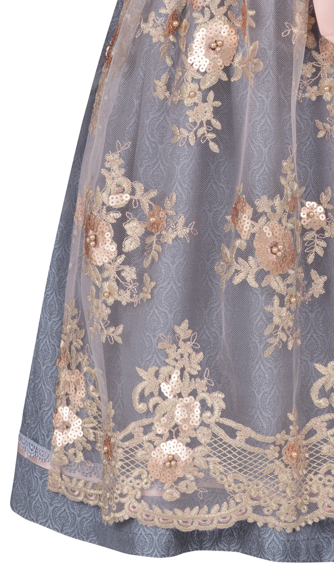 Verzaubern Sie Ihre kleine Prinzessin mit unserem traumhaften Kinderdirndl Gerhild in Rauchblau von Nübler, dass ideal für festliche Anlässe wie Hochzeiten, Geburtstage oder Volksfeste geeignet ist und Ihre Tochter begeistern wird. Das Kleid ist aus einem hochwertigen Material gefertigt, welches mit einem dezenten Blumenmuster verziert ist. Um den eckigen Ausschnitt und den Kragen herum verlaufen eine Posamenten-Borte und eine Froschmaul-Borte. Die Metall-Miederhaken zum Schnüren sind mit Glitzersteinen besetzt und werden durch ein farblich passendes Miederband ergänzt. Auch den Rocksaum schmücken zwei edle Borten. Auf der Rückseite befindet sich der Reißverschluss, um das An- und Ausziehen zu erleichtern. Die Dirndlschürze ist aus einem glanzvollen Netzstoff in Rosa gefertigt und hat ein florales Muster mit Pailletten und Perlen bestickt, das für einen Hauch von Glamour sorgt. Die Dirndlbluse hat perlmuttartige Verschlussknöpfe und Ärmel aus Spitze, die einen zauberhaften Look erzeugen. Der elastische Bund wiederum sorgt für einen optimalen Sitz und Tragekomfort. Mit diesem schicken Kinderdirndl liegen Sie immer richtig und verbinden stilsichere Mode mit Tradition.