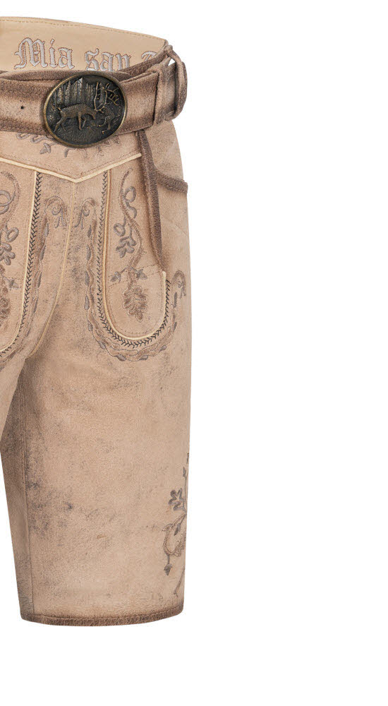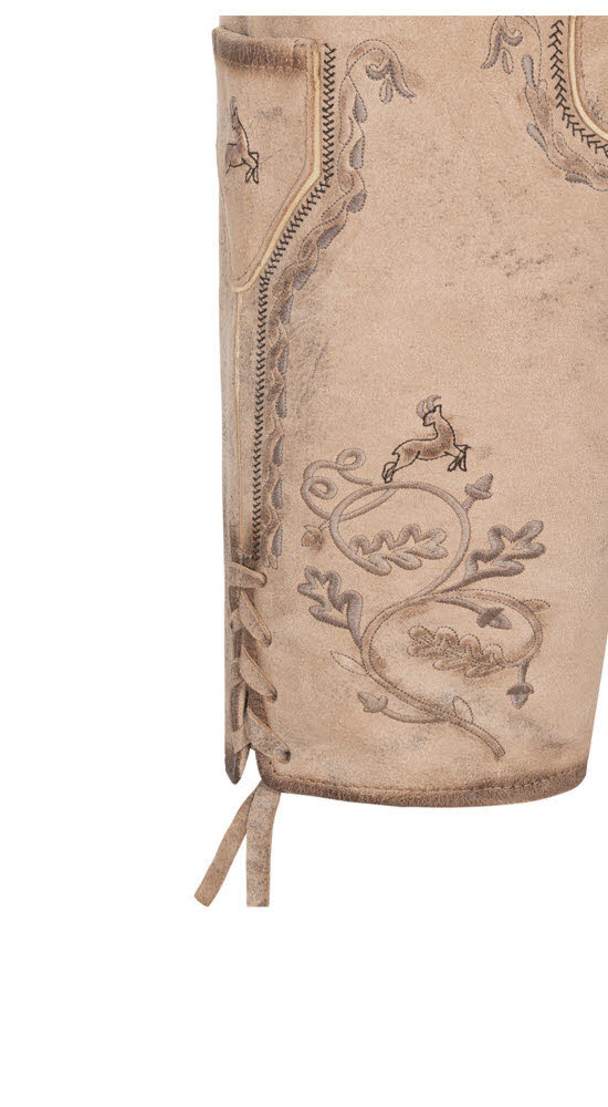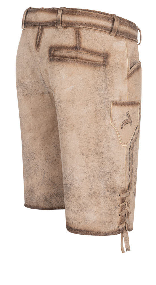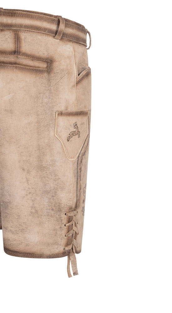 Es steht ein besonderer Anlass bevor? Dann brauchen Sie unbedingt unsere besondere kurze Lederhose Torben in Natur von Nübler. Die wunderschönen Reliefstickereien an den Beinen und am Latz sehen auf dem hellen Leder sehr edel aus. Auch das Messertascherl rechts am Bein ist mit einem Hirsch bestickt. Die Beinabschlüsse werden seitlich mit Lederbändchen geschnürt. Auf der Rückseite befindet sich eine obligatorische Brotzeitfalte, die der Regulierung der Bundweite dient. Die Hose verfügt über zwei Eingriffstaschen und eine Gesäßtasche für Ihren Geldbeutel. Ein richtiger Eyecatcher ist der Ledergürtel, dessen Schnalle zwei Hirsche beim Kampf zeigt. In dieser Lederhose sind Sie perfekt gekleidet und können sich auf jeder Festlichkeit sehen lassen. Sie werden mit Sicherheit alle Blicke auf sich ziehen.