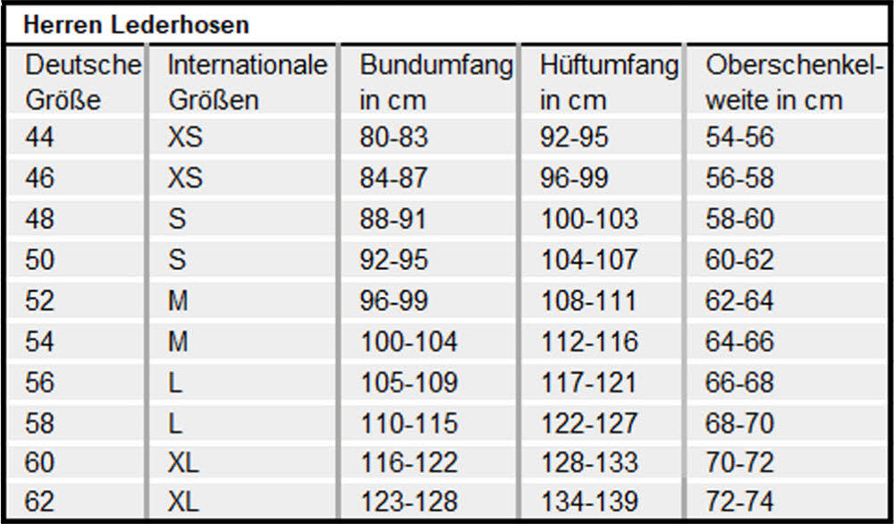Die Lederhose sollte beim Kauf eng sitzen, da sie sich nach mehrmaligen Tragen noch weitet. Wie stark sich die Lederhose weitet, richtet sich nach der Häufigkeit des Tragens. Generell gilt: Im Bund kann sich die Lederhose 2-3cm dehnen, im Oberschenkelbereich 3-5cm. Wichtig ist, dass die Lederhose im Schritt, an der Naht gut sitzt, da sie sich hier nicht mehr weitet.