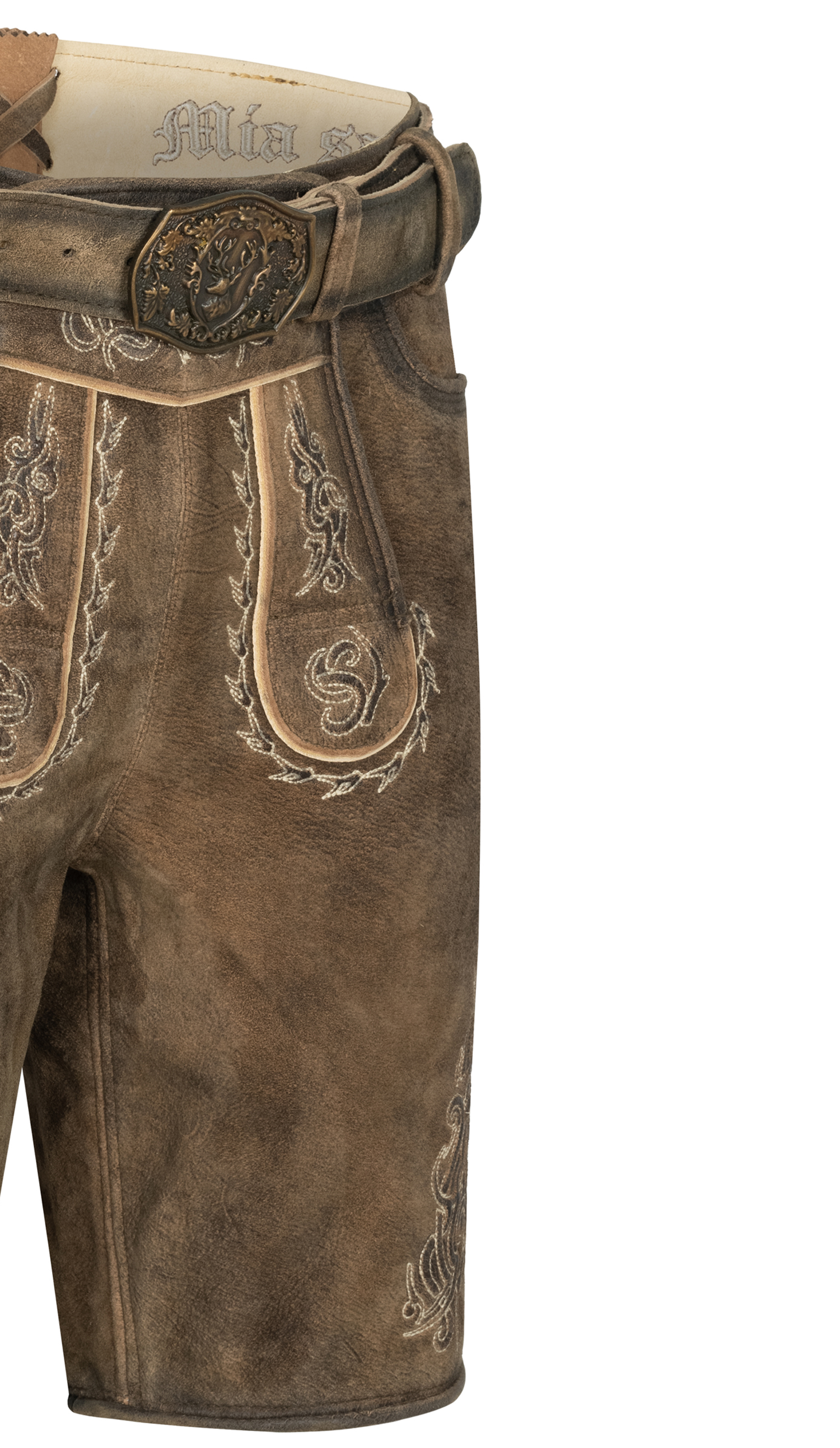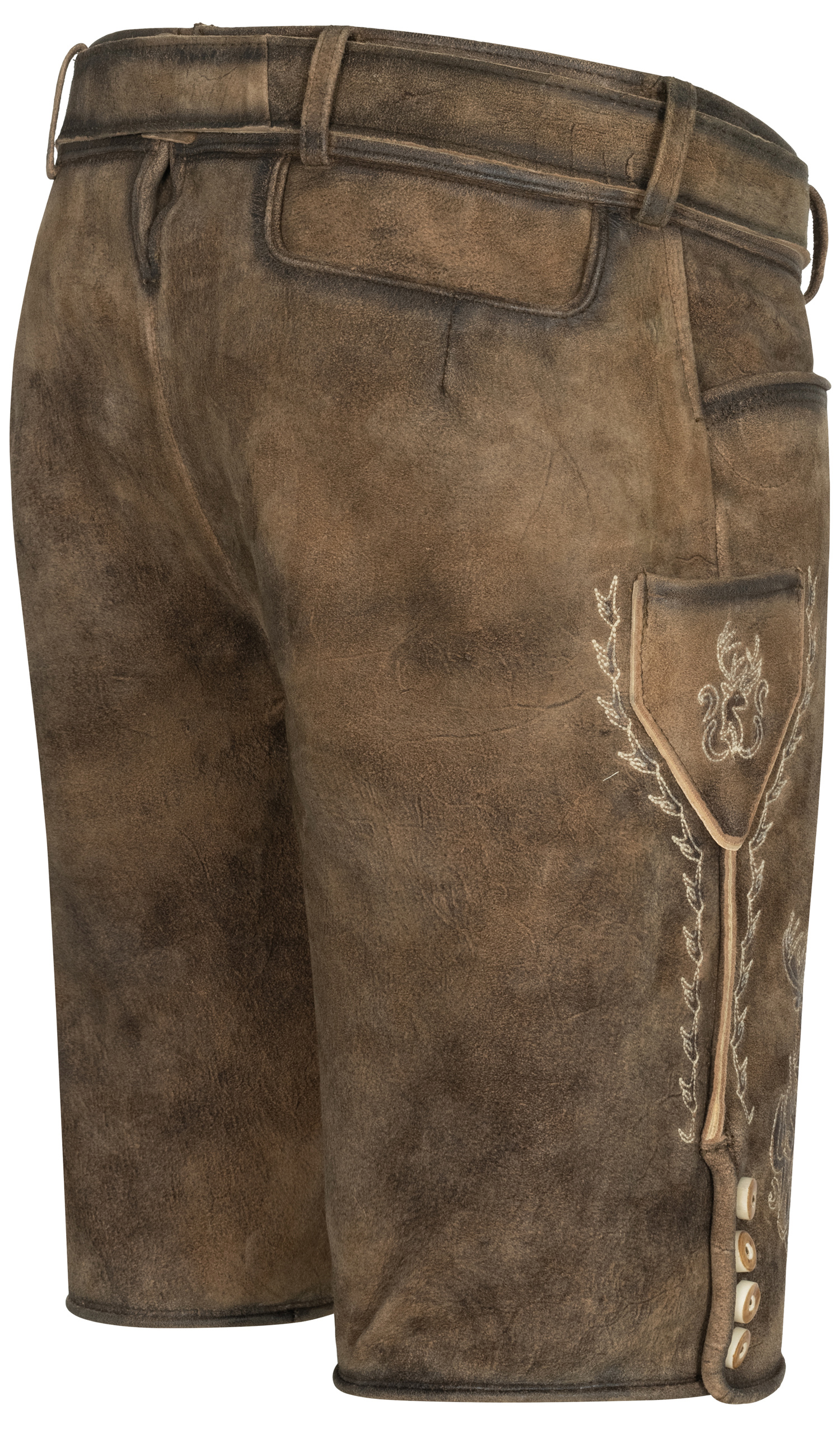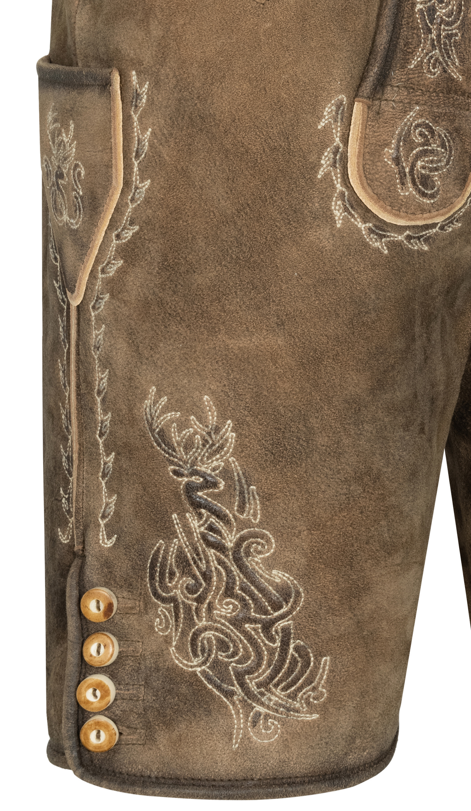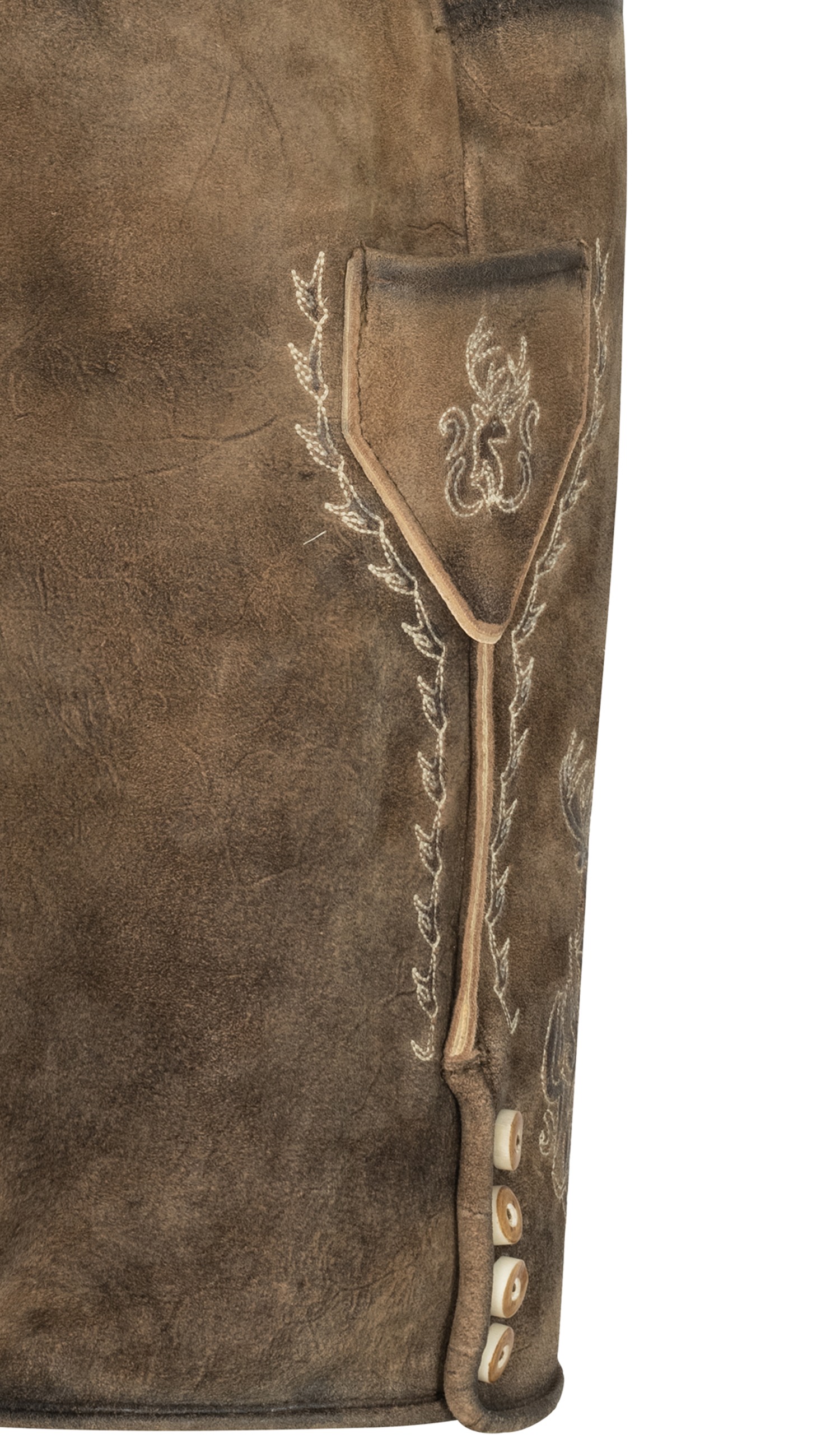 Mit der Lederose Wilster von Nübler liegen Sie genau richtig! Das braun-beige Modell aus hochwertigem Wildbockleder beeindruckt mit aufwendigen Reliefstickereien, die ihm einen edlen Charakter verleihen. Der angesagte Used-Look sorgt gleichzeitig für eine lässige, authentische Note. Praktisch und stilvoll zugleich: Zwei Eingriffstaschen, eine kleine Seitentasche und eine Gesäßtasche bieten Platz für das Nötigste. Typische Details wie der Latz zum Aufknöpfen, die Brotzeitfalte sowie Knöpfe in Hirschhornoptik runden das Design ab. Als besonderes Extra gehört ein passender Ledergürtel mit Schnalle im bayrischen Wappenmotiv dazu. Ob Oktoberfest, Volksfest oder Familienfeier, diese Lederhose ist ein echtes Statement und garantiert ein Blickfang.