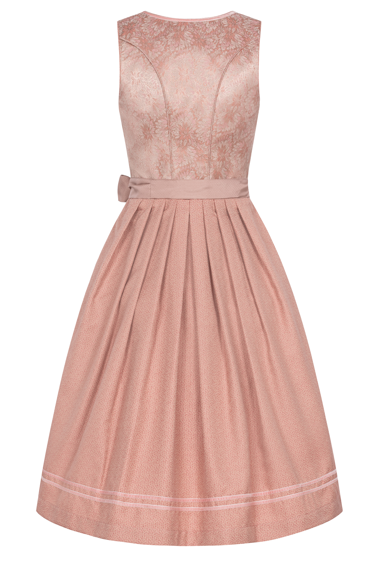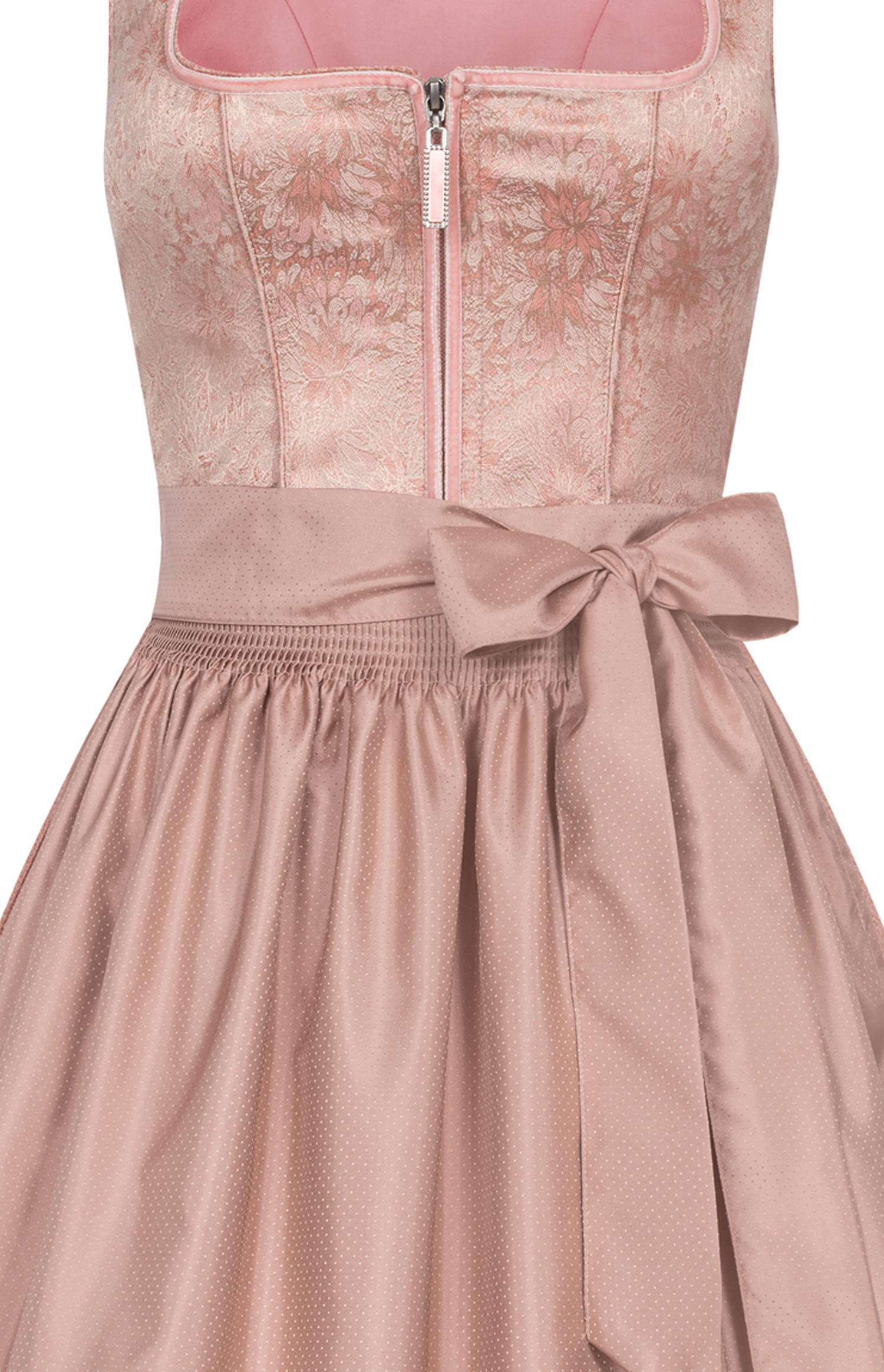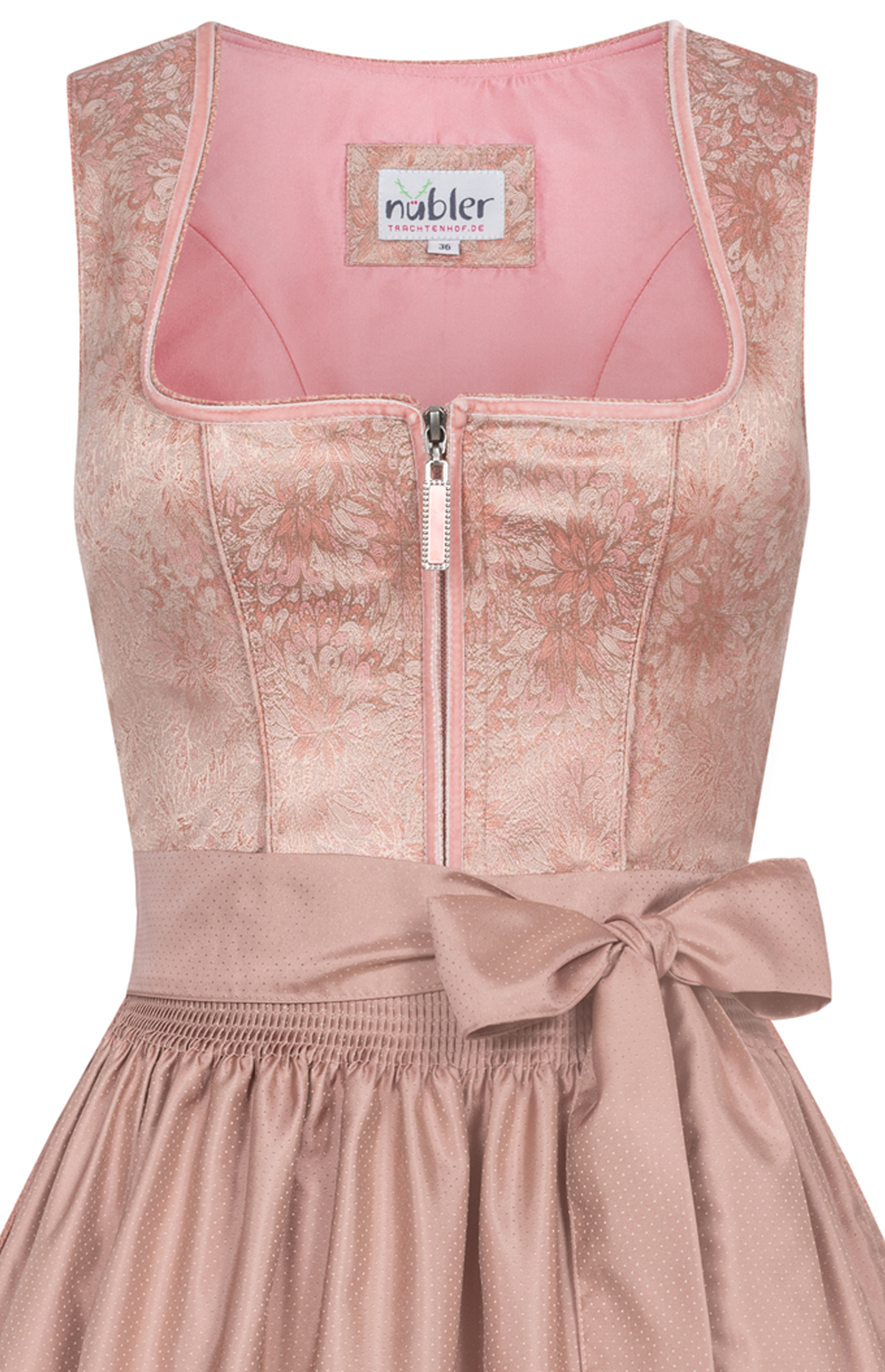 Sie möchten sich ein neues Dirndl zulegen, das sowohl elegant als auch modern ist?Dann haben wir genau das Richtige für Sie: Unser Midi Dirndl Gepa in Apricot von Nübler ist ein echter Hingucker. Es besteht aus hochwertigem Jacquard, das einen leichten Schimmer hat und mit einem opulenten Blumen Muster verziert ist. Die Farbe Apricot verleiht dem Dirndl einen romantischen Touch. Das Oberteil hat einen eckigen Ausschnitt, der von einer Samtborte umrandet ist. Geschlossen wird das Dirndl vorne durch einen Reißverschluss, der von einem schicken Zipper ergänzt wird.Der Rock hat eine seitliche Eingriffstasche und ist in einem erdigen Ton gehalten, der einen schönen Kontrast zum Oberteil bildet. Den Rocksaum schmücken zwei feine Samtborten. Die Schürzte ist dezent mit Kleinen punkten Muster und wurde am Saum durch eine Faltennaht verschönert. Dieses Dirndl ist eine gelungene Mischung aus festlich und modern und eignet sich für viele Anlässe. Ob Sie auf eine Hochzeit, eine Geburtstagsfeier oder ein Volksfest gehen, mit diesem Dirndl werden Sie alle Blicke auf sich ziehen.Warten Sie nicht länger und bestellen Sie sich dieses traumhafte Dirndl noch heute! Tipp:Sie möchten Ihr Dirndl noch mehr zur Geltung bringen?Dann empfehlen wir Ihnen, auch einen passenden Dirndl BH oder eine Dirndl Bluse bei uns zu erwerben. Mit einem Dirndl BH können Sie Ihr Dekolleté optimal betonen und Ihrem Dirndl einen verführerischen Touch geben. Mit einer Dirndl Bluse wiederrum, können Sie Ihrem Dirndl einen romantischen oder verspielten Touch hinzufügen.Bestellen Sie jetzt auch Ihren Dirndl BH oder Ihre Dirndl Bluse und vervollständigen Sie Ihr traumhaftes Trachten-Outfit.Lieferhinweis:Unsere Dirndl werden, soweit nicht anders vermerkt, ohne Dirndlbluse, passenden Accessoires und Schuhen geliefert. Pflegehinweis:30°C Feinwäsche, bei niedriger Temperatur bügeln.Wer auf Nummer sicher gehen will, legt beim Bügeln ein Baumwolltuch zwischen Tracht und Bügeleisen.Material:Oberstoff: 50% Viskose, 40% Polyester, 10% LeinenFutter: 100% PolyesterRock: 50% Viskose, 40% Polyester, 10% Leinen