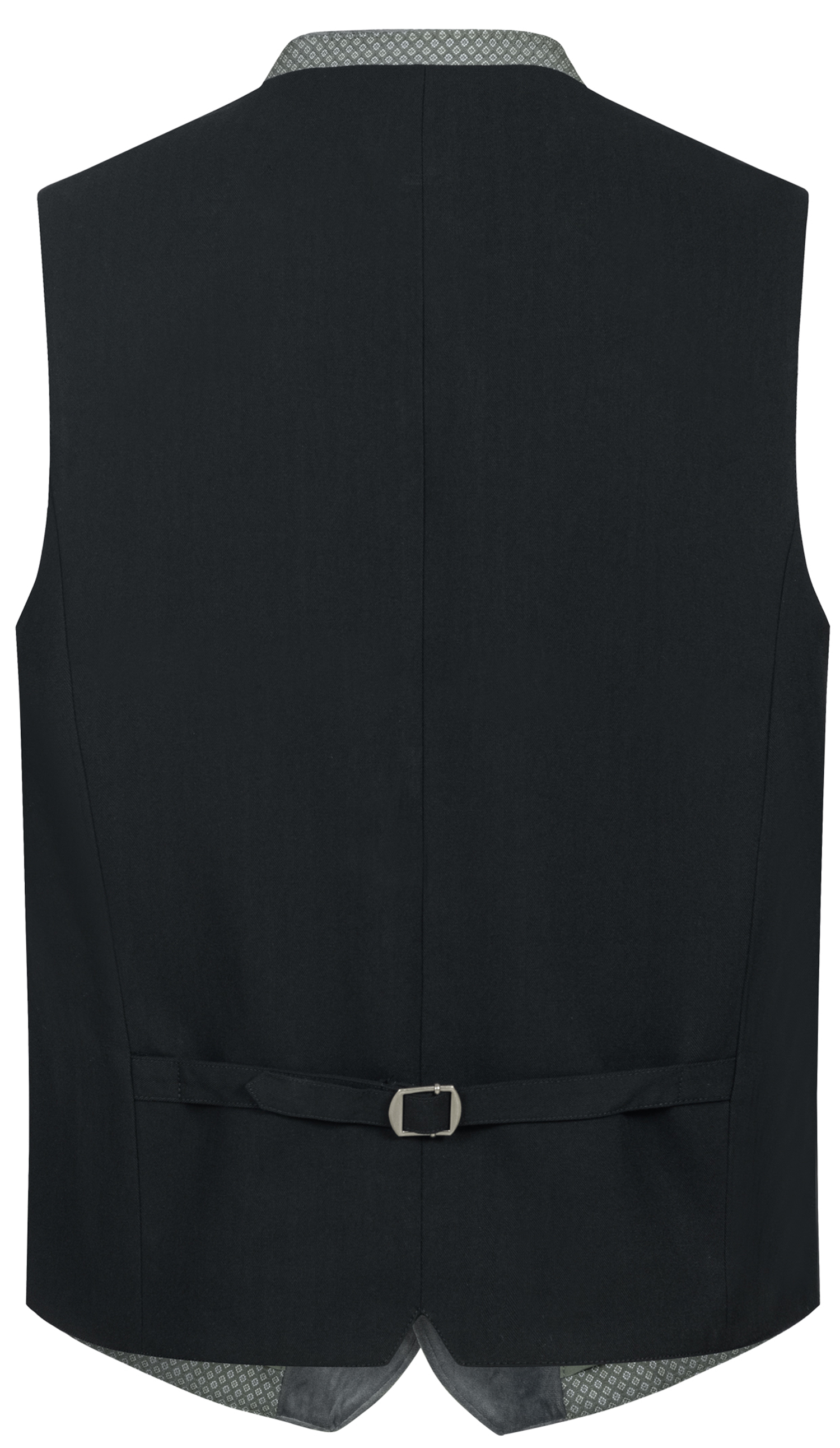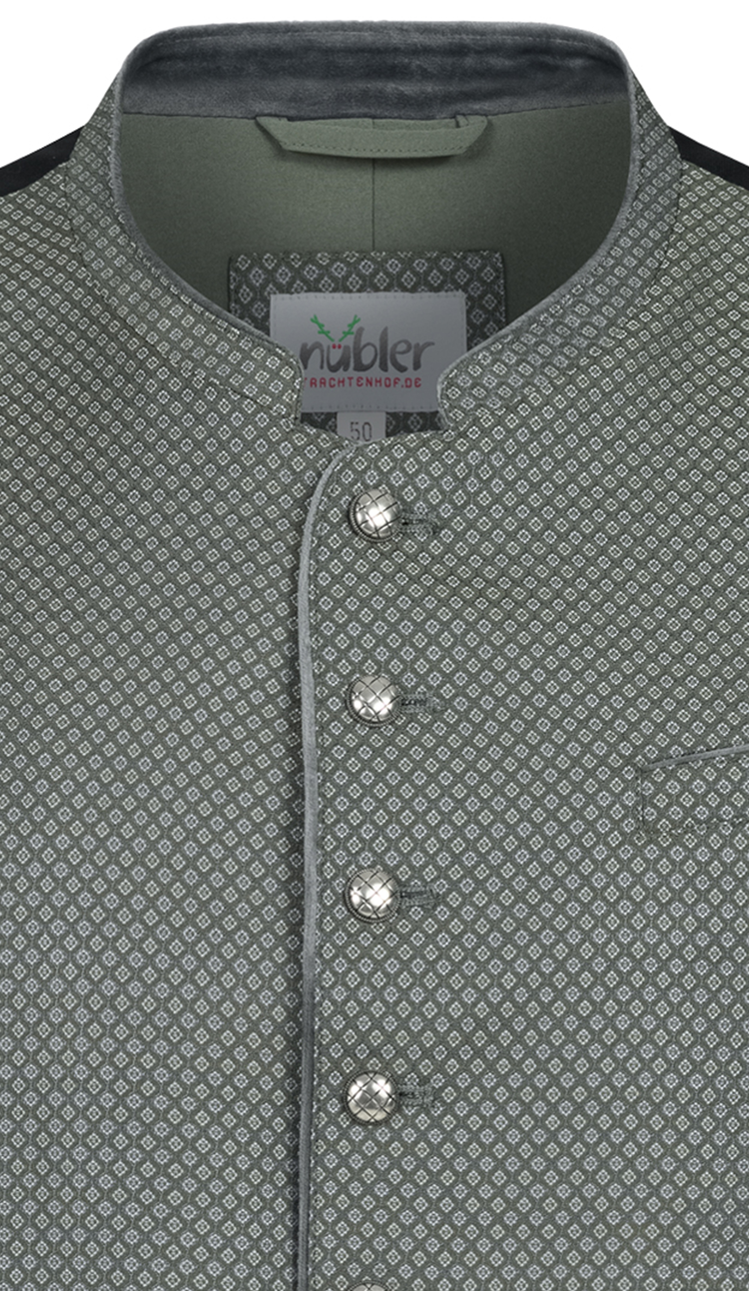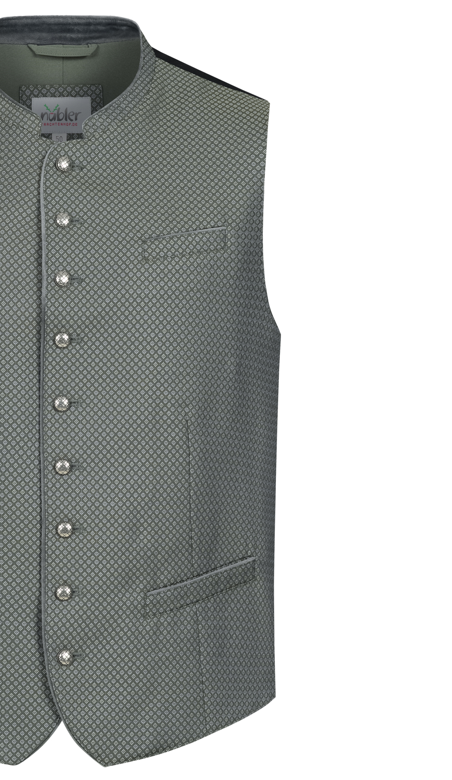 Das Trachtengilet Werner in Grün von Nübler vereint klassische Eleganz mit moderner Zurückhaltung. Das Vorderteil ist mit einem gleichmäßigen Rautenmuster versehen, das dem Gilet seine feine Struktur gibt. Die Knopfleiste besticht durch edle Knöpfe im Altsilber-Look mit Rauten geschmückt, die für einen stilvollen Akzent sorgen. Der schlichte Stehkragen sowie die dezent eingefassten Brust- und Seitentaschen runden das elegante Gesamtbild ab und machen das Gilet vielseitig kombinierbar. Auf der schwarzen Rückseite befindet sich ein silberfarbener Rückenriegel zur Weitenregulierung.