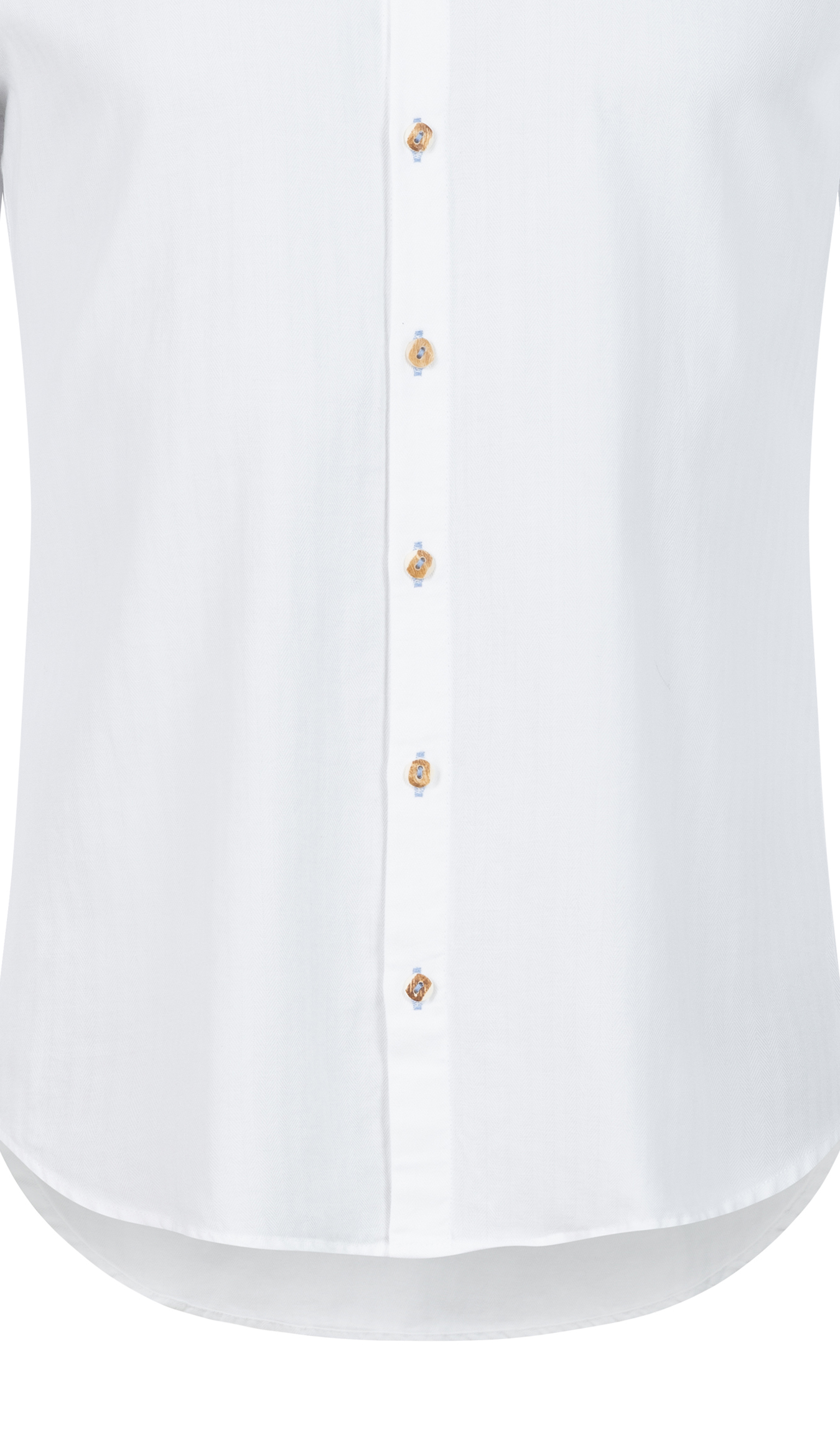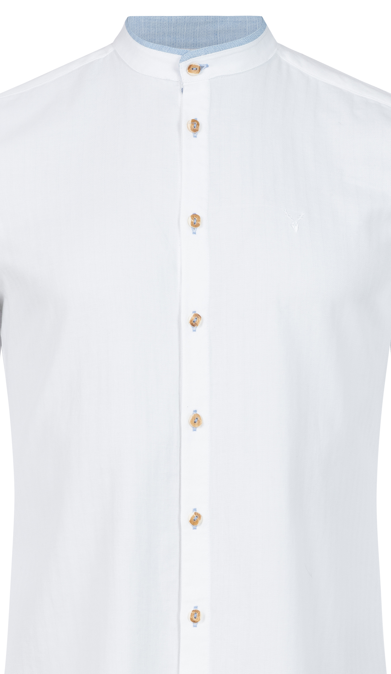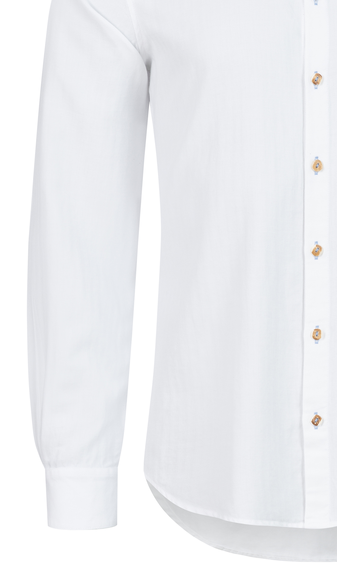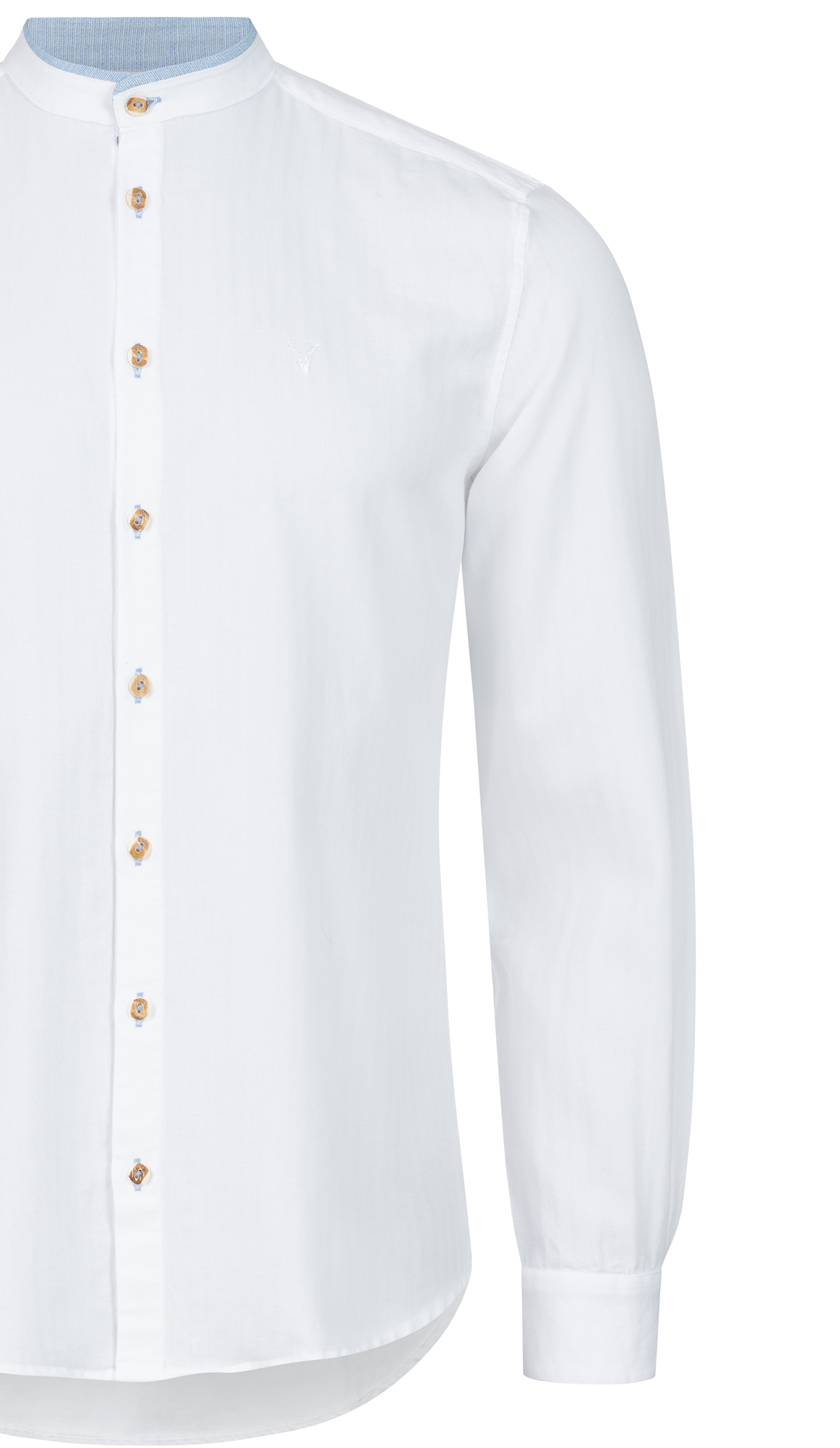 Das weiße Trachtenhemd Paul ist ein einfacher Begleiter, der sich jeder Lederhose perfekt anpasst. Das Hemd ist gerade geschnitten und verfügt über einen Stehkragen. Auf der Vorderseite befindet sich in Brusthöhe eine kleine Hirschkopfstickerei. Die Knöpfe in der Farbe braun-beige sind in einer klassischen Hirschhornoptik gehalten. Die Lochknöpfe wurden mit einem hellblauen Garn umnäht. Durch den hohen Baumwollanteil ist es sehr angenehm zu tragen. Dieses Trachtenhemd können sie garantiert zu jedem Anlass tragen.