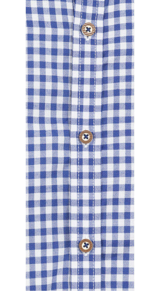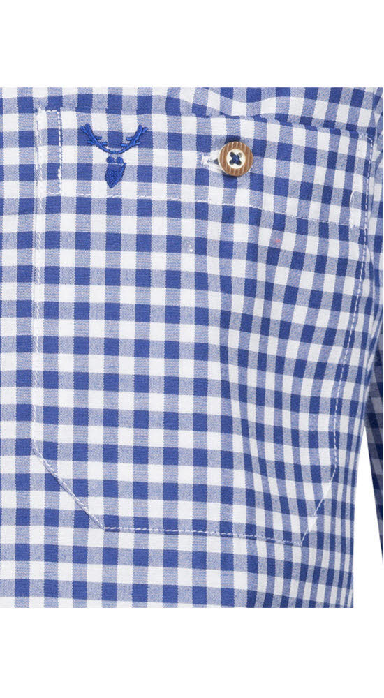 Das Trachtenhemd Sepp im traditionellen Karomuster ist der perfekte Begleiter für laue Kirwaabende. Es ist in den Farben Blau und Weiß gehalten. Vorne links ist eine Brusttasche angebracht, welche mit einer perfekt farblich dazu passende Hirschstickerei verziert ist. Das Hemd wird mit Knöpfen in Hirschhornoptik verschlossen.