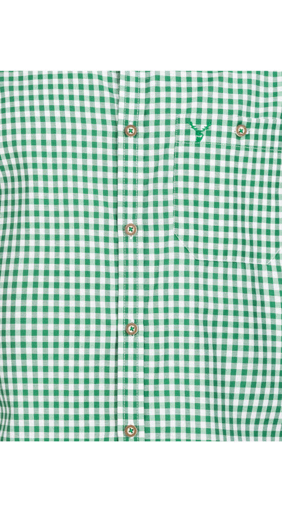 Das Trachtenhemd Sepp im traditionellen Karomuster ist der perfekte Begleiter für laue Kirwaabende. Es ist in den Farben Grün und Weiß gehalten. Vorne links ist eine Brusttasche angebracht, welche mit einer perfekt farblich dazu passende Hirschstickerei verziert ist. Das Hemd wird mit Knöpfen in Hirschhornoptik verschlossen.