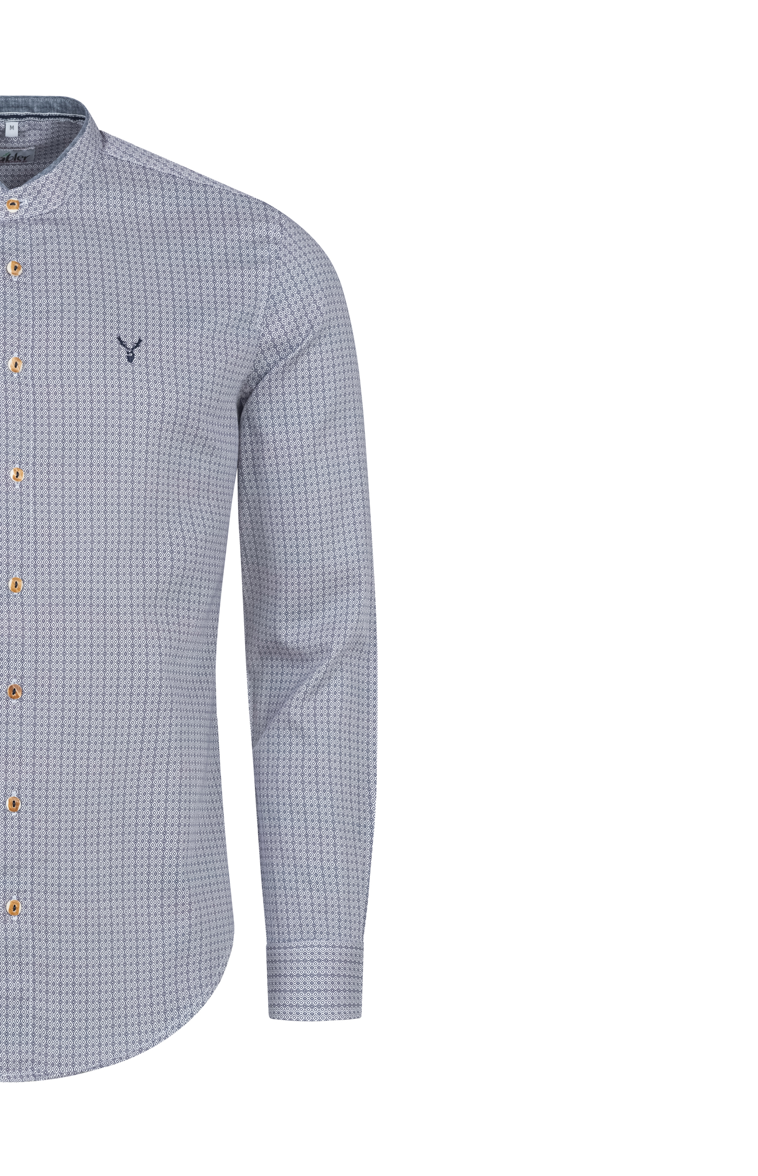 Sie sind auf der Suche nach einem besonderen Hemd? Unser Langarm Trachtenhemd Paavo in Blau von Nübler ist außergewöhnlich in seiner Musterung. Kleine Rauten ergeben ein ausgefallenes Muster. Auf der linken Brust ist ein kleiner Hirsch aufgestickt, der ein traditionelles Aussehen verleiht. Die Knöpfe in Hirschhornoptik sorgen zusätzlich für eine trachtige Erscheinung. Abgerundet wird es mit einem modernen Stehkragen.