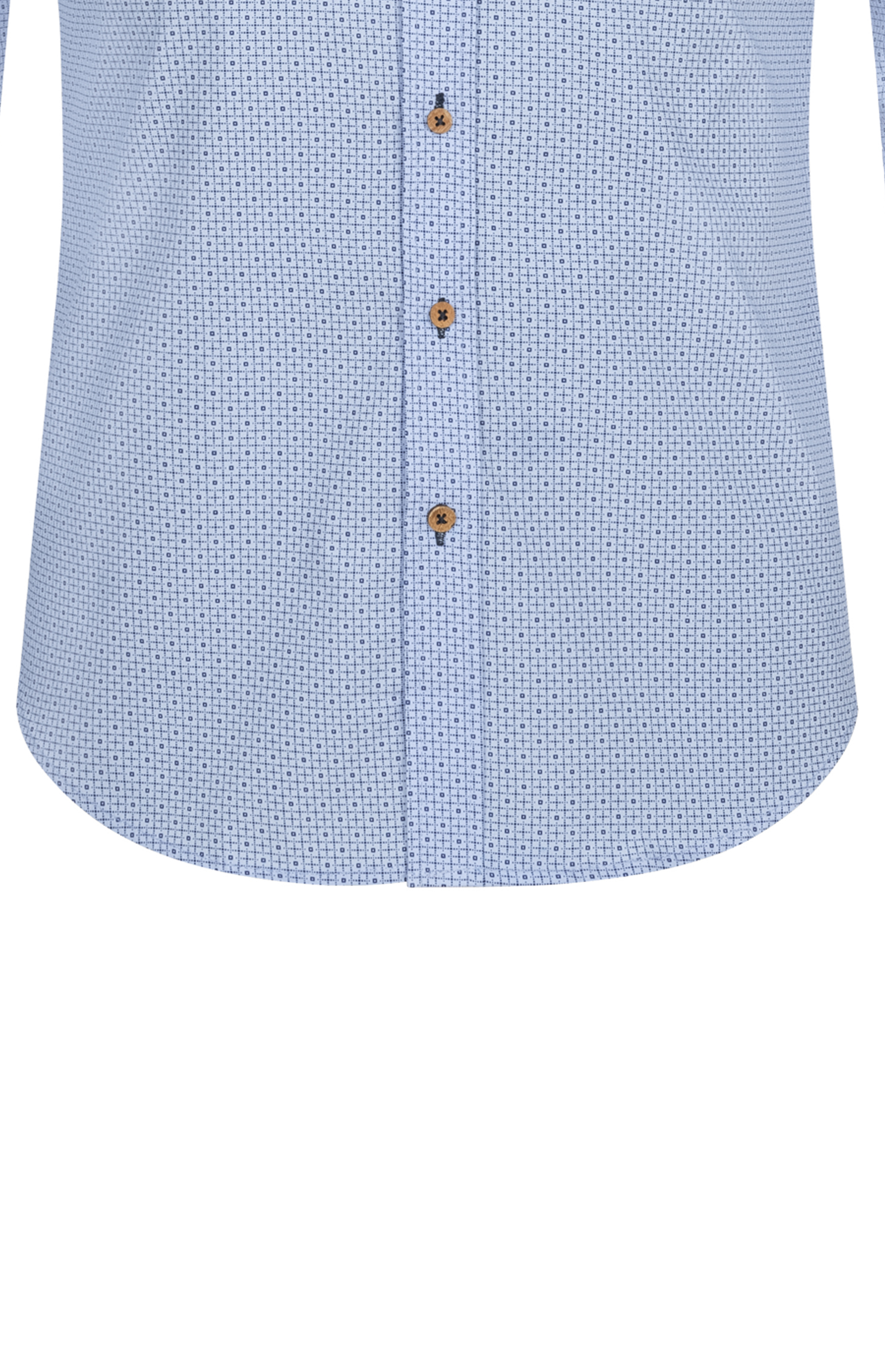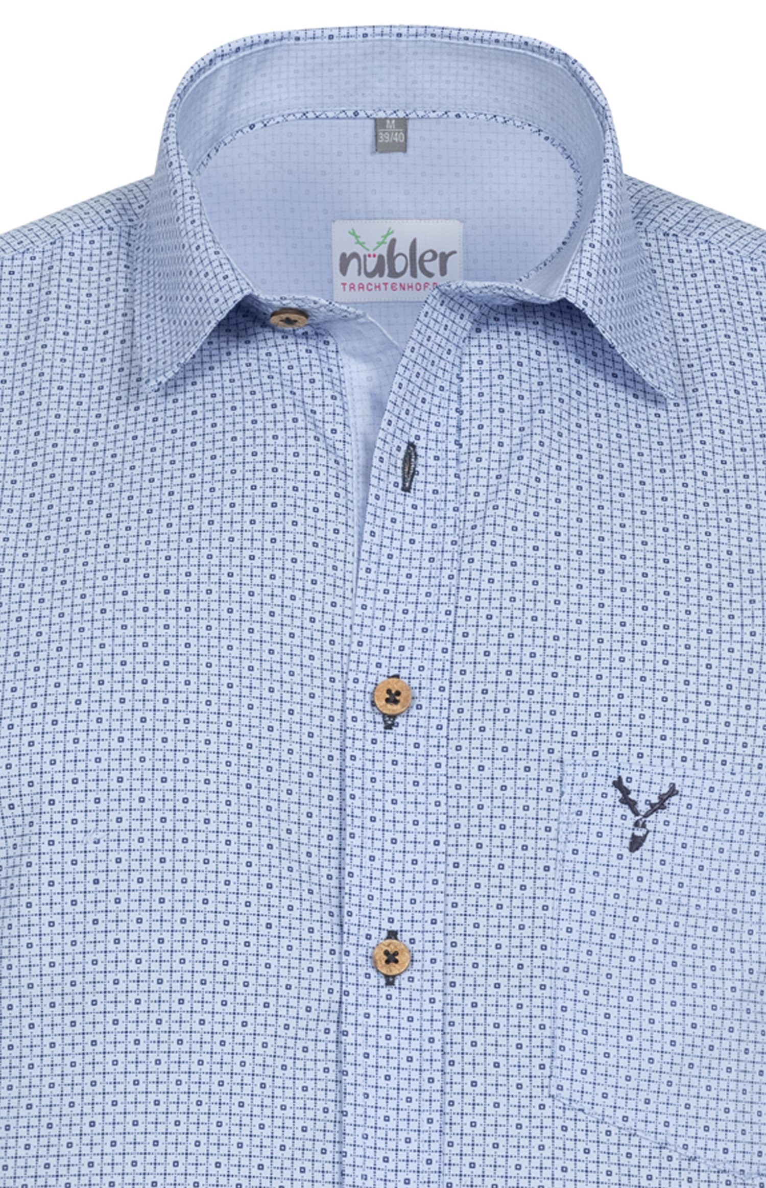 Mit dem Trachtenhemd Pelle in Blau aus dem Hause Nübler sind Sie auf jeder Festlichkeit perfekt gekleidet. Das Hemd ist mit einem dezenten geometrischen Muster aus kleinen, dunklen Quadraten. Es hat braune Knöpfe auf der Vorderseite und an den Manschetten. Auf der linken Seite befindet sich ein gestickter Hirsch in der Farbe Dunkelblau. Dieses Trachtenhemd passt sowohl zur Lederhose als auch zu jeder Jeans. Es kann im Alltag als auch auf jeder Kirchweih, Volksfest oder Familienfest getragen werden.