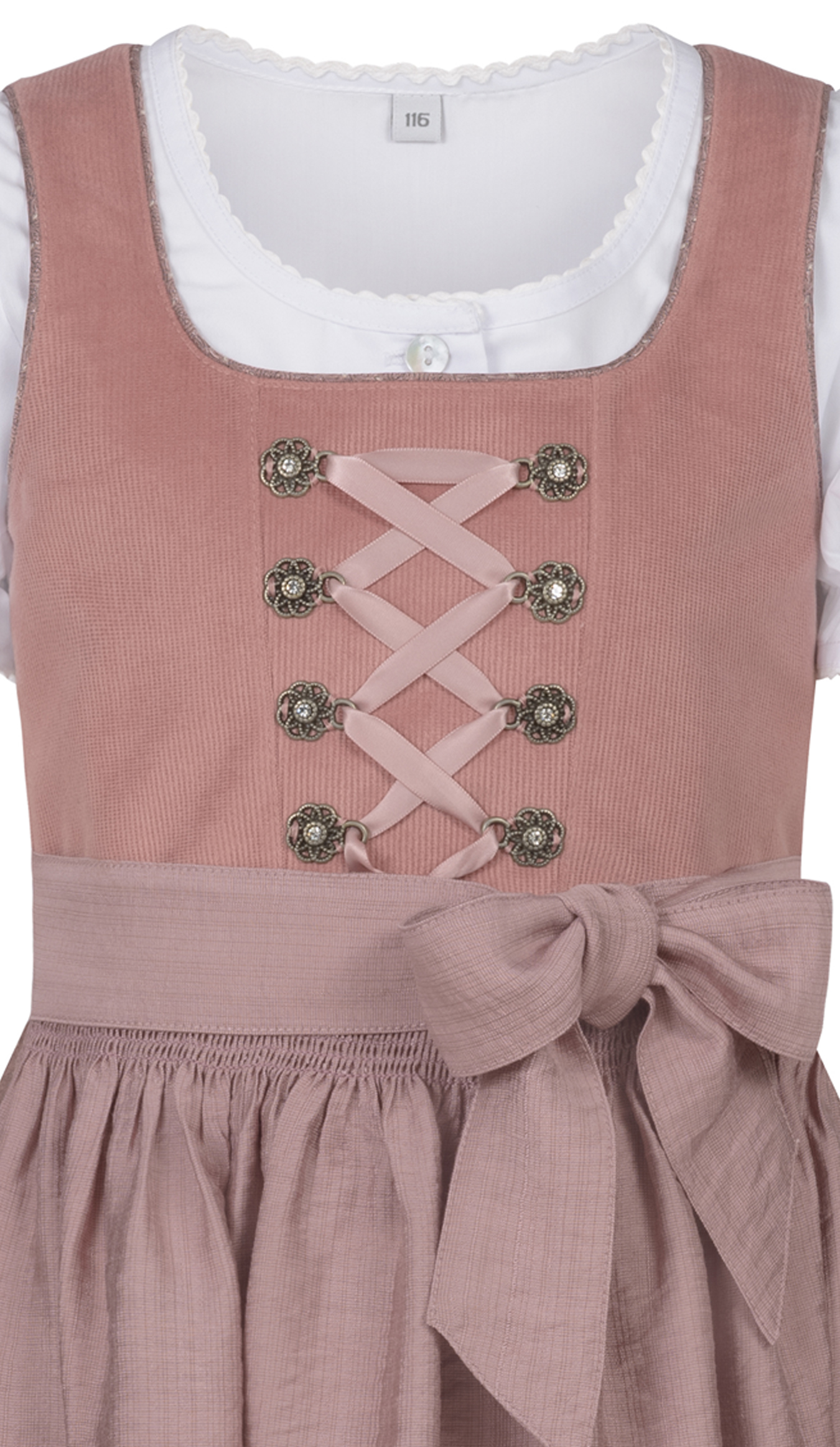 Unser fesches Kinderdirndl Kim Kid in Peach aus dem Hause Nübler, lässt jedes Mädchen in eine Prinzessin verwandeln. Das Oberteil aus feinem Cord bietet einen angenehmen Tragekomfort und verleiht dem Dirndl eine edle Note. Der glänzende Rock ist mit dezentem rautenförmigem Muster und Akzenten verziert. Das Miederband wird von Miederhaken in der Farbe Altsilber und in der Form von Blumen gehalten. Zusätzlich sind an den Miederhaken kleine Glitzersteinchen angebracht. Das Kinderdirndl wird hinten mit einem Reißverschluss verschlossen. Die perfekt dazu passende Bluse ist am Ausschnitt und den Ärmeln mit einer kleinen Blumenborte besetzt. Die Schürze ist schimmernd Peach, das dem Dirndl seinen letzten Schliff gibt. Mit diesem Kinderdirndl wird das Mädchen garantiert zum Hingucker auf jeder Kirchweih, Hochzeit, Kommunion, Taufe, Firmung, Konfirmation, Familienfeier oder jedem anderen Fest.