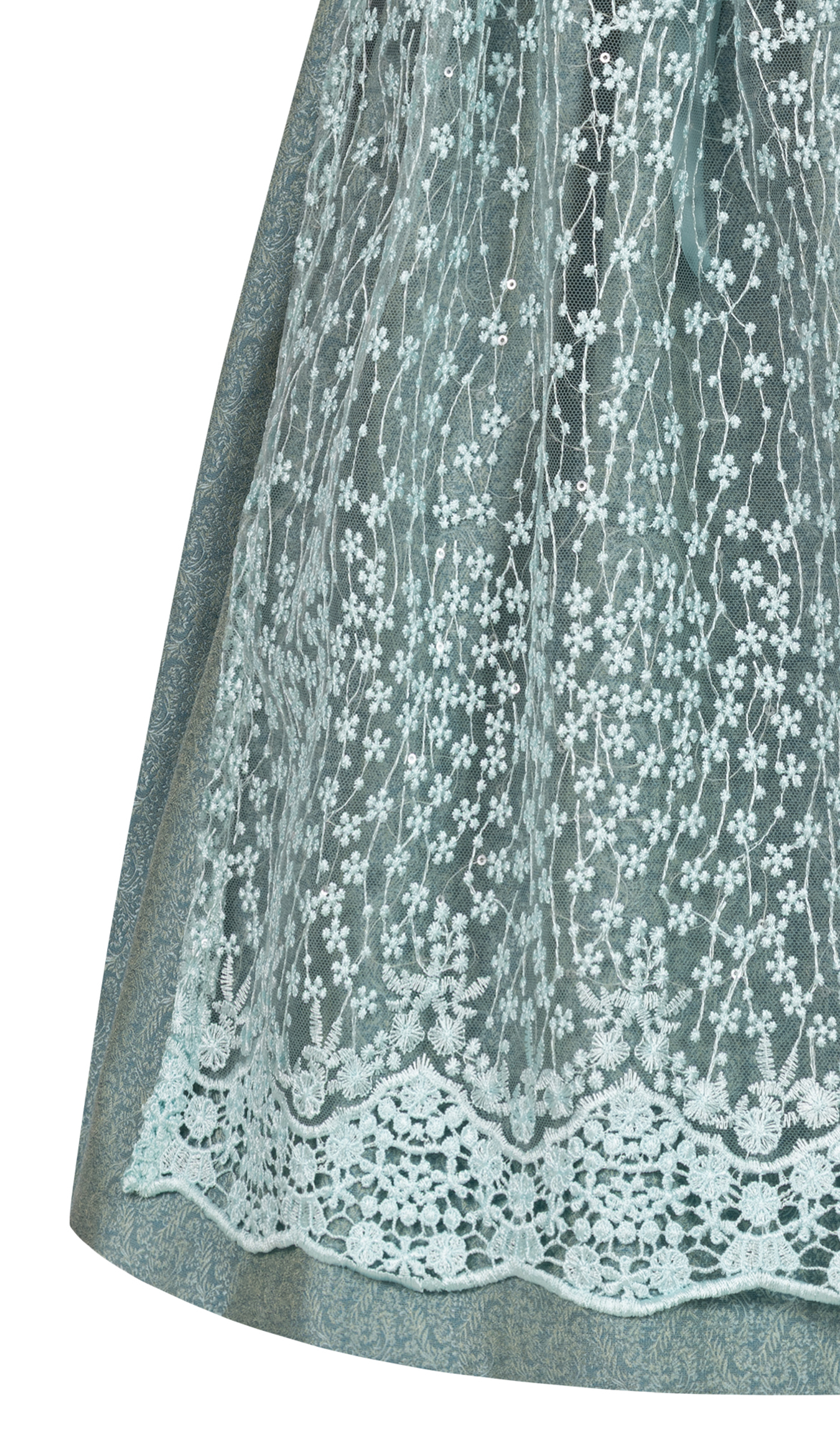 Das Kinderdirndl Gianna von Nübler in edlem Petrol zieht alle Blicke auf sich und lässt kleine Fashionstars glänzen. Traditionelle Elemente treffen hier auf modernen Chic, wodurch ein stilvolles und zugleich kindgerechtes Outfit entsteht. Der Ausschnitt ist mit einer plissierten Borte eingefasst, im Brustbereich setzen funkelnde Miederhaken mit Steinchen elegante Akzente, die sich mit Band oder Kette schnüren lassen. Ein praktischer Reißverschluss im Rücken sorgt für leichtes Anziehen. Die weiße Bluse mit elastischen Spitzenärmeln bietet hohen Tragekomfort und genügend Bewegungsfreiheit. Ein besonderes Highlight sind die beiden transparenten Schürzen, die mit feinen Blütenstickereien und glitzernden Pailletten verziert sind. Sie verleihen dem Dirndl eine verspielte Leichtigkeit und lassen es im Licht schimmern – fast wie ein kleines Kunstwerk. Ob Volksfest, Hochzeit, Familienfeier oder Geburtstag – mit dem Kinderdirndl Gianna ist der große Auftritt garantiert.